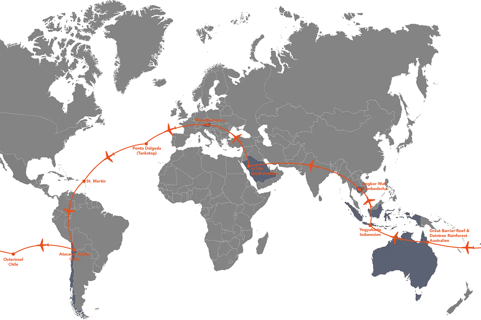Eine Reise für alle Sinne Ob der Duft exotischer Gewürze auf der Insel Java, das leuchtende Farbenspiel dee Great BarrierReef oder die unendliche Stille der Atacamawüste – diese Reise weckt alle Sinne und ermöglicht es Ihnen, die Welt auf eine einzigartige und intensive Weise zu erleben.